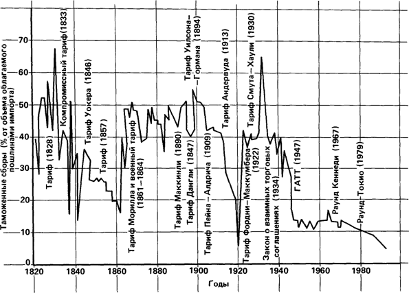 Рисунок 4. Таможенные пошлины в США в 1820—1988 гг.