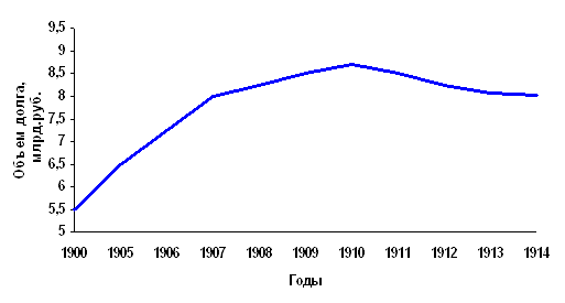 Итак, кредитная история России началась в 1769 г., когда Екатерина II сделала первый заем в Голландии. За последующие два с половиной столетия Российская империя заняла на рынке примерно 15 млрд. руб. Большая часть этих средств накануне революции была погашена. К этому моменту старейшими займами в составе русского государственного долга оставались 6%-ные займы 1817-18 гг. Их нарицательный капитал составлял 93 млн. руб., а непогашенная часть к 1 января 1913г. равнялась 38 млн. руб. На графике отражена динамика государственного долга Российской империи в начале XX в.: сумма задолженности возросла в период русско-японской войны и революции, а затем стабилизировалась.
