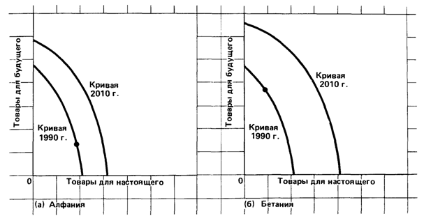Предположим теперь, что существуют две экономики, Алфания и Бетания, которые в данный момент во всех отношениях идентичны, за исключением того, что в настоящее время (1990 г.) Алфания на ее кривой производственных возможностей отдает предпочтение не "товарам будущего", а "текущим товарам". Точка на рисунке 4(а) отражает эту альтернативу. В свою очередь, Бетания в настоящее время (1990 г.) отдает предпочтение выпуску большего объема "товаров будущего" за счет уменьшения объема "товаров для настоящего" (рисунок 4(6). Следовательно, при неизменности всех прочих позиций можно предвидеть, что будущая (2010 г.) кривая производственных возможностей Бетании окажется значительно более смещенной вправо, чем кривая Алфании. Иначе говоря, избрав сегодня структуру производства, которая более благоприятствует технологическому прогрессу, увеличению количества и повышению качества материальных и людских ресурсов, Бетания сумеет обеспечить больший экономический рост, чем Алфания, чей сегодняшний выбор структуры производства менее сориентирован на те товары и услуги, которые способствуют смещению кривой производственных возможностей вправо. Руководствуясь исключительно идеей примата средств производства, Бетания предпочитает делать больше пристроек к своей "национальной фабрике", то есть инвестировать большую долю своей текущей продукции, чем Алфания. Такой выбор обеспечивает Бетании компенсацию, или выгоду, в форме более быстрого экономического роста — в виде большей производственной мощности в будущем. Разумеется, это достигается ценой меньшего объема потребительских благ для текущих нужд.