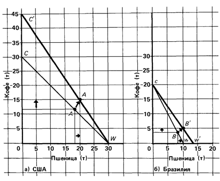 Специализация, основанная на использовании принципа сравнительных преимуществ, способствует более эффективному размещению мировых ресурсов и увеличению производства как пшеницы, так и кофе, а потому выгодна и США, и Бразилии