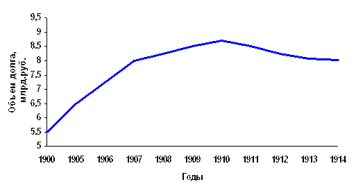 Кредитная история России началась в 1769 г., когда Екатерина II сделала первый заем в Голландии. За последующие два с половиной столетия Российская империя заняла на рынке примерно 15 млрд. руб. Большая часть этих средств накануне революции была погашена. К этому моменту старейшими займами в составе русского государственного долга оставались 6%-ные займы 1817-18 гг. Их нарицательный капитал составлял 93 млн. руб., а непогашенная часть к 1 января 1913г. равнялась 38 млн. руб. На графике отражена динамика государственного долга Российской империи в начале XX в.: сумма задолженности возросла в период русско-японской войны и революции, а затем стабилизировалась.