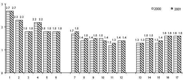 На фоне первостепенных экономических трудностей такой фактор, как недостаток квалифицированного персонала, имеет невысокий рейтинг (1.5). Несмотря на то, что спад производства недавних лет вызвал значительный отток квалифицированных кадров из промышленности, предприятия еще не осознали в полной мере значимости этого явления. Не в последнюю очередь подобное отношение обусловлено качеством самих инноваций, не отличающихся высоким уровнем новизны, не связанных в достаточной степени с принципиально новой продукцией и тяготеющих преимущественно к менее радикальным изменениям.