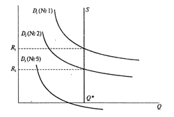Предположим, что качество земельных участков которые можно вовлечь в сельскохозяйственный оборот, абсолютно не одинаково. Пусть сельскохозяйственные производители производят только один продукт. Пусть также арендный рынок земли вполне конкурентен: много фермеров готовы арендовать землю и много землевладельцев – сдать её в аренду. На рынке любого другого фактора производства при этих условиях цена на фактор формировалась бы под воздействием спроса и предложения: высокая цена вела бы к расширению предложения, а рост предложения вёл бы к снижению цены. Равновесие установилось бы под воздействием обеих составляющих рынка. Земля, как мы уже выяснили, является ограниченным ресурсом, и если отвлечься от некоторых частных случаев возможного расширения предложения земли, то кривая предложения земельных участков будет совершенно вертикальной. Спрос же на землю, как показал ещё Д. Рикардо, формируется под воздействием спроса на сельскохозяйственный продукт. В результате земельная рента формируется так, как это показано на рисунке 1.