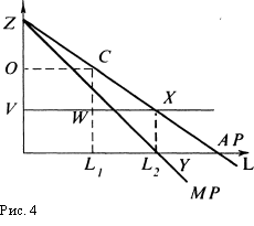 Неэффективность избыточного количества труда при обработке того же участка земли представлена треугольником WXY, т. е. областью, где предельные издержки превышают предельный продукт. Она равняется ренте, которая существовала бы при использовании L1 единиц труда {WXZ= VZW=OWVC).