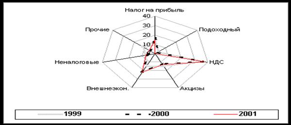Структура доходов федерального бюджета в 1999-2001 гг.(январь-сентябре) (в % к общей сумме доходов)