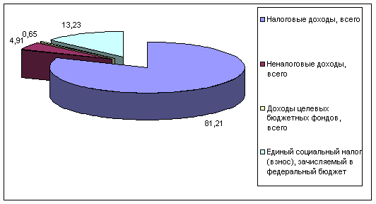 Данные свидетельствуют, что 81,1 % всех доходов бюджета составляют налоговые доходы, а около 44,81 % налоговых доходов бюджета составляет налог на добавленную стоимость (налоговые доходы - это обязательные, безвозмездные, безвозвратные платежи в пользу бюджета). Необходимо отметить, что ряд федеральных налогов являются регулирующими, т.е. часть из них направляются в бюджеты субъектов РФ и местные бюджеты. Полностью в федеральный бюджет поступают такие налоги, как, например, акцизы на товары, ввозимые на территорию РФ, таможенные пошлины, таможенные сборы и иных таможенные платежи.