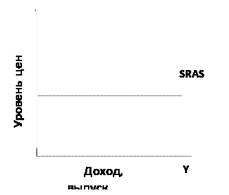 . В данном случае принято экстремальные допущения о неизменности всех без исключения цен. Поэтому краткосрочная кривая совокупного предложения (SRAS)