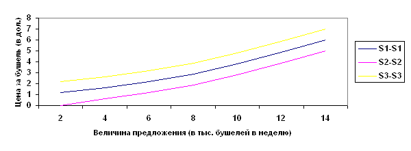 Понятие предложения, так же как и спроса, полезно представить в графическом изображении. Оси на рис. 3-4 те же, что и на рис. 3-3, только место величины спроса здесь заняла величина предложения.