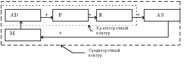 Первопричина роста цен (кредитная политика денежных властей, денежная эмиссия, изменение валютного курса и т.д.), -- на блок-схеме она вынесена в среднесрочный контур ,-- достаточно важна, но для развития инфляционных процессов особенно важен второй этап. Перейдя в среднесрочный контур совокупный спрос AS, наталкивается на ограничения, связанные с фактическим объемом денежной массы в обращении. При определенных условиях сжатие денежной массы может уменьшить совокупный спрос. При расширении денежной массы происходит рост уровня цен. Другими словами, само по себе увеличение спроса порождает не столько инфляцию, сколько ее угрозу.