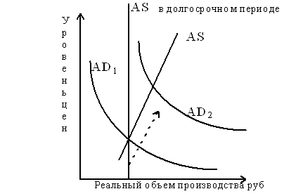 На рисунке (рисунок b. инфляция спроса) рост денежной массы сдвигает кривую совокупного спроса с уровня AD1 на уровень AD2 . Сдвиг кривой совокупного спроса происходит вдоль фиксированной кривой совокупного предложения. Неудовлетворенный спрос позволяет поднимать цены , незначительно увеличивая объем производства.