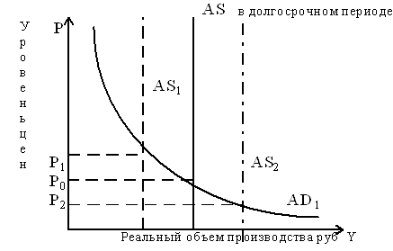 Проиллюстрируем сказанное графически (рисунок e). На осях координат отражается динамика уровня производства (Y) и цен (Р). Прямая AS описывает совокупный уровень предложения товара i и изменяется относительно осей координат в зависимости от масштабов производства. Кривая AD показывает уровень платежеспособного спроса. Пересечение двух кривых в точке А отражает базисное состояние равновесия рынка, которому соответствуют уровень производства Y и цена Р. Уменьшение масштабов производства до уровня Y обусловливает сдвиг прямой AS влево до положения AS1 . Новое состояние равновесия, соответствующее изменившемуся предложению товара i, будет отражаться точкой В, которой соответствует новый, более высокий уровень цен Р1. Аналогично увеличение рыночного предложения вызовет сдвиг прямой AS вправо и будет стимулировать снижение цен до уровня Р2 . При этом Р2 < Р .